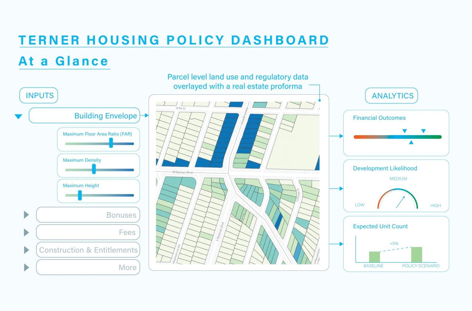 A brief Modeling New Housing Supply in Los Angeles: Simulations from the Terner Housing Policy Dashboard (now named the Terner Housing Supply Simulator) co-published by the Terner Center & Labs uses the Terner Housing Supply Simulator to simulate six policy options to encourage new home building in Los Angeles. The Simulator is a data-driven simulation tool designed to help policymakers and planning staff better understand the impacts of different choices on new housing supply. The Simulator overlays a real estate proforma—the calculations that determine whether a new building is financially feasible—on top of parcel-level land use and regulatory data for all residential parcels in a given city.